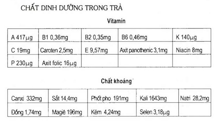 Trà là một loại thức uống rất giàu vitamin và khoáng chất. Ở mỗi loại trà khác nhau, thì hàm lượng vitamin và khoáng chất giữa chúng cũng khác nhau. Ví dụ: đối với Vitamin C chẳng hạn, thì trà