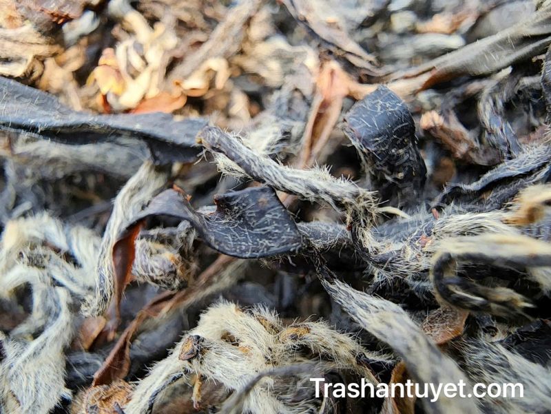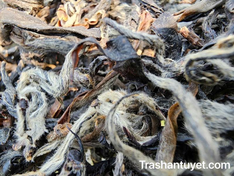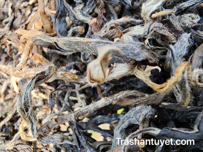 - Phẩm trà màu đen, được phủ một lớp lông mịn trắng dày