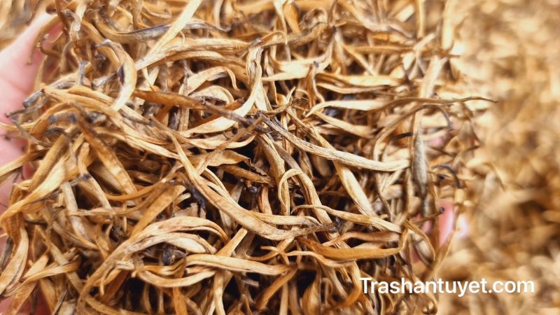 - Búp trà to mập đều, màu vàng đồng sáng, bên ngoài là những lớp lông mịn trắng sáng.